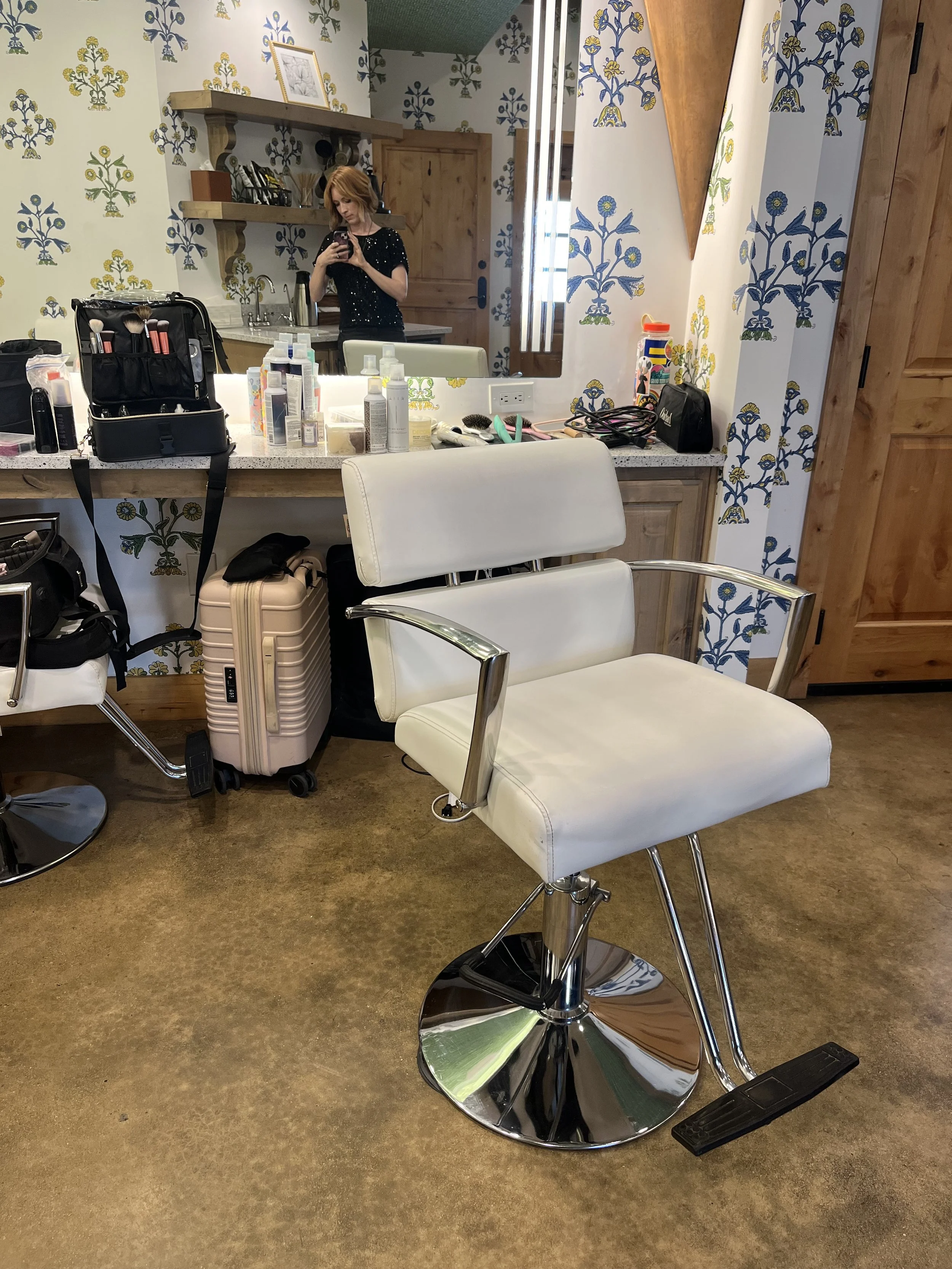 First off, the chairs! So often spaces have cute chairs but if I’m being honest logistics are more important than cuteness. Logistics allow us to better service you and not kill our bodies in the process. Also Camp Lucy proved you don’t have to sacrifice cute to be effective. What makes these chairs so special? They have a hydraulic pump to be able to adjust the height! Many times there is a high chair that looks like a “good height” but rarely is it a good height for all heights of people, ( tall vs short), and it will be at a height that’s more beneficial for one service over the other. With an adjustable chair we can raise someone up if they are shorter or receiving makeup or lower them if they are taller or receiving hair. I’m not sure why it’s so challenging to find chairs with hydraulic pumps in wedding venues, (maybe because they likely cost more), but I’m so grateful that Camp Lucy invested in them.