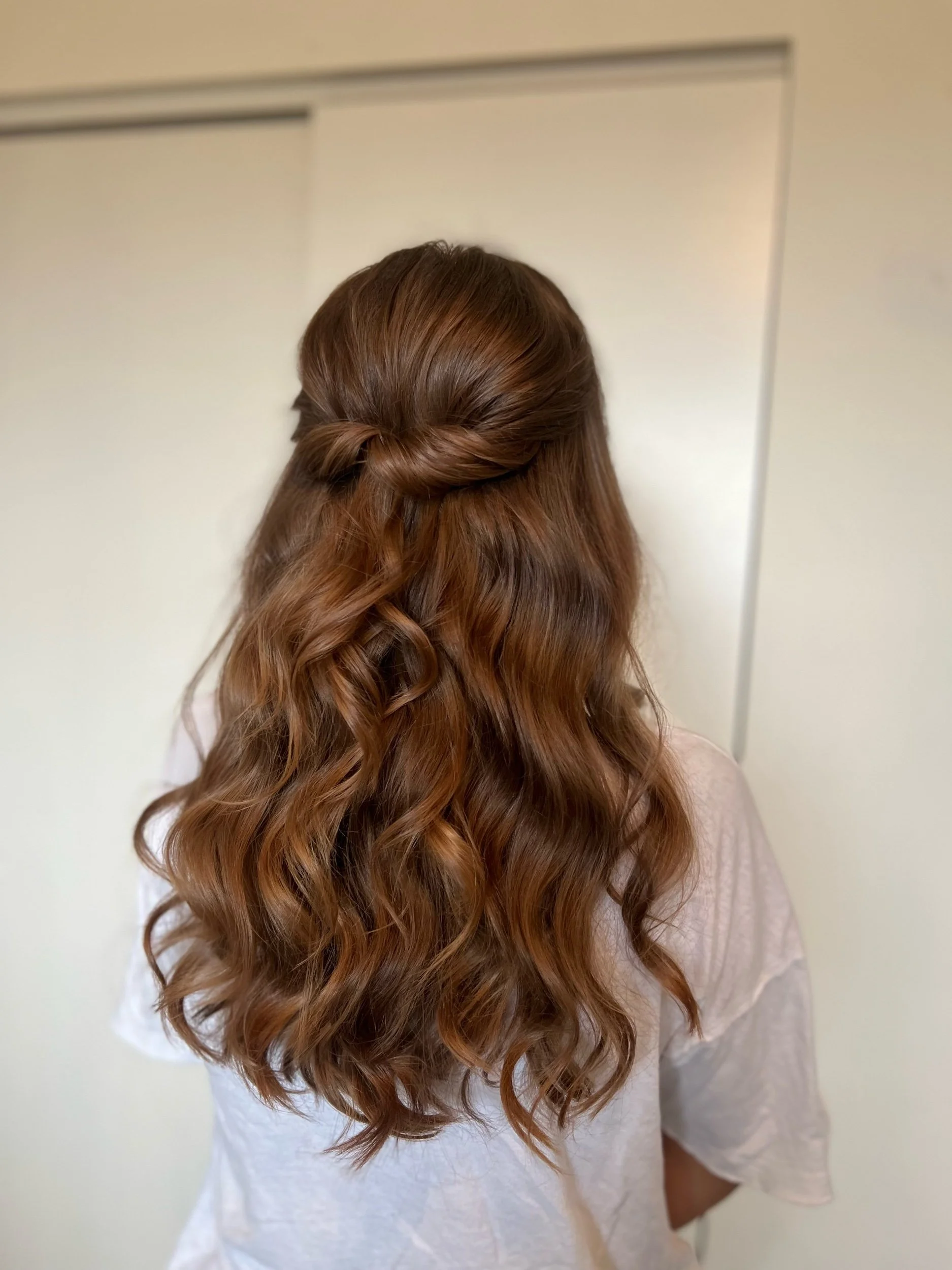 To provide an example if “Suzy” has collar bone length hair that has a bit of a natural wave and is considering either 1/2 up or fully up. Her hair has some frizz and she sweats around her neck especially when it’s warm. It would be wise for the stylist to bring up that the sweating on the neck could be a concern with her hair 1/2 up and the sweating could bring out more frizz so perhaps an updo may be best logistically. The stylist can mitigate frizz but it’s important for Suzy to not touch her hair because this will create more. There are frizz mitigating salon treatments as well if she was concerned and wanted to go a stronger route. She wants to retain her natural curl pattern so any inspiration photos that do not have a natural curl it should be understood or mentioned that her hair will look a bit different though still beautiful. Without extensions they can still create a beautiful up but if she wants the bun fuller or crown to have more volume then there is the option of extensions. Since Suzy normal wears her hair down on a daily basis it’s advised to keep some pieces framing her face. I would still recommend showing both a 1/2 up and fully up option so she has the ability to see both but point out the thought process all along the way.